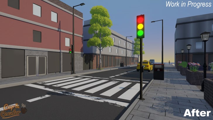 This week has had a strong focus on improving the overall feel and world of Cup and Counter. In particular, we have tried to make the whole game world feel more alive and evolving by working on systems such as the traffic and pedestrian systems.